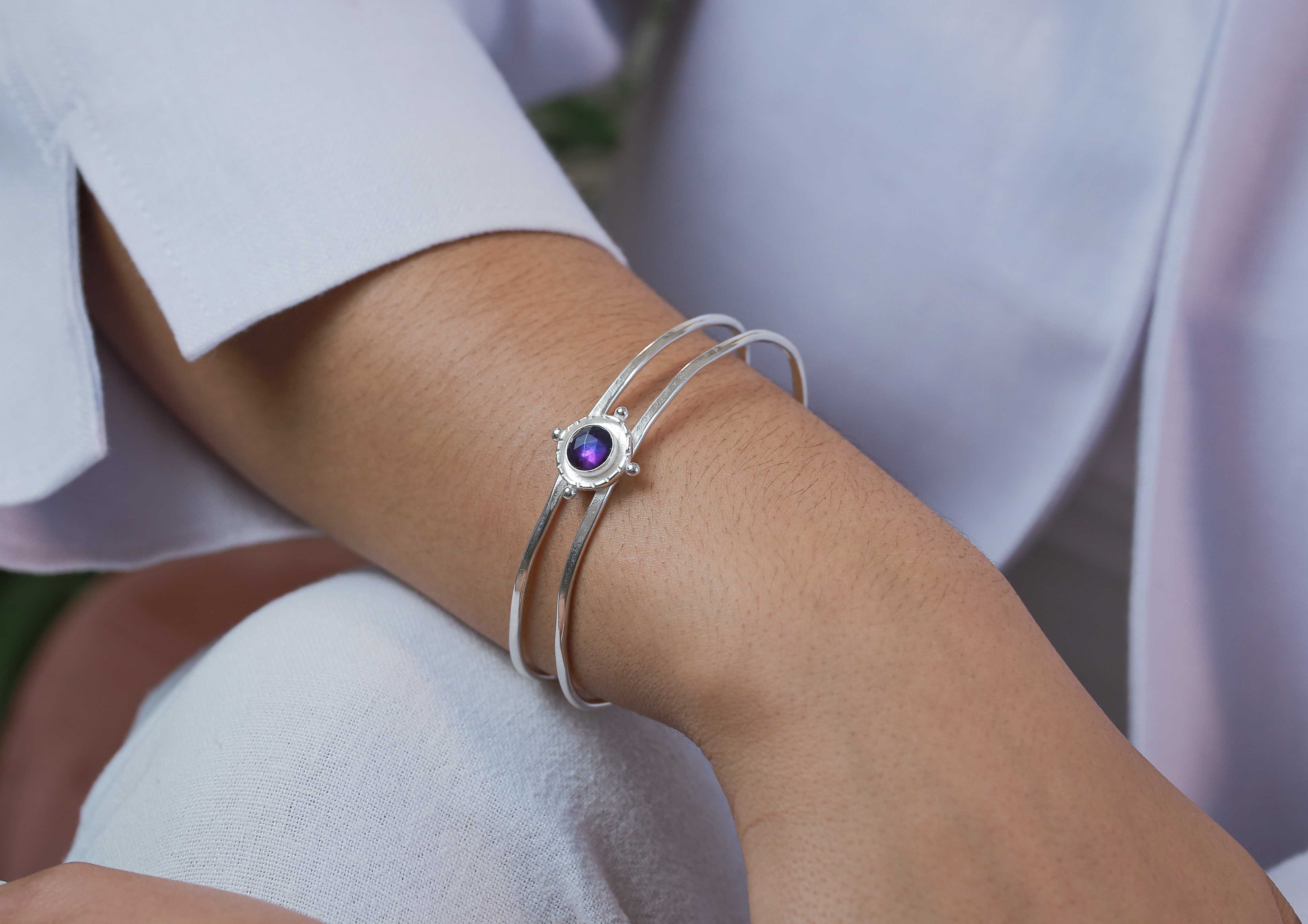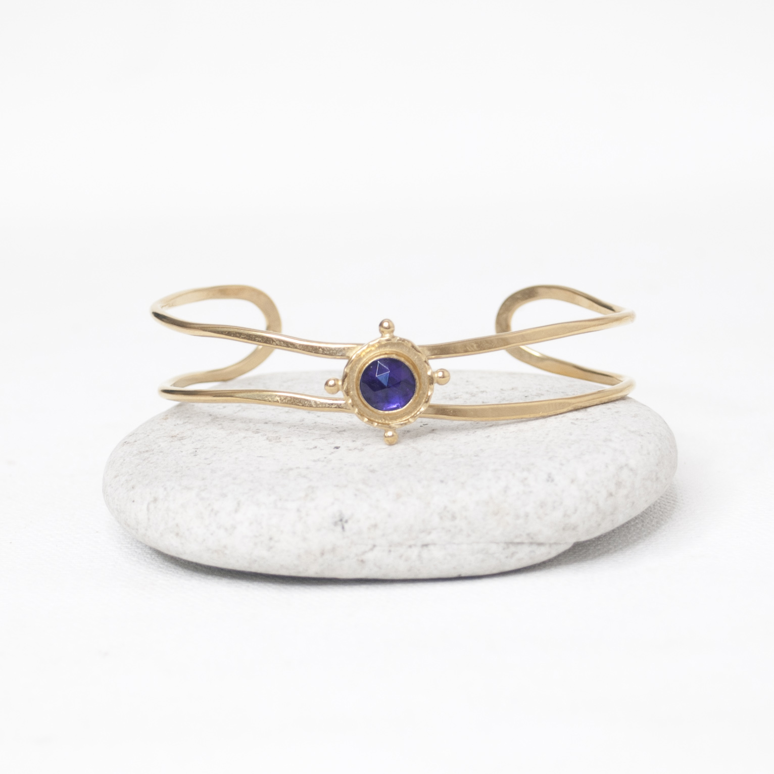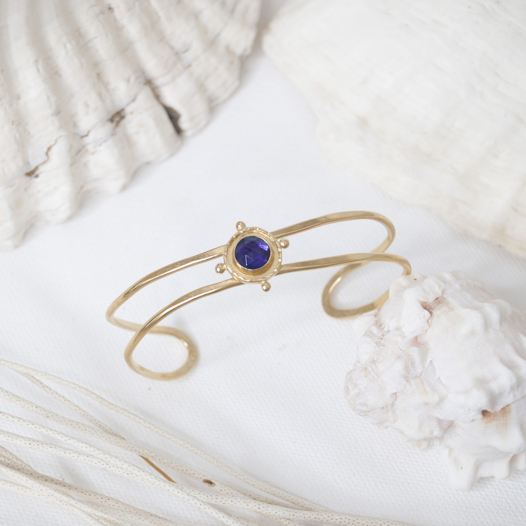 Strong ships aren't meant for safe harbours. Inspired by the helm of an old sea faring ship, this Gold Amethyst Gem Medallion Cuff Bracelet is designed to accompany you as you navigate the joys of life. Perfect solo and great when layered with other bracelets!