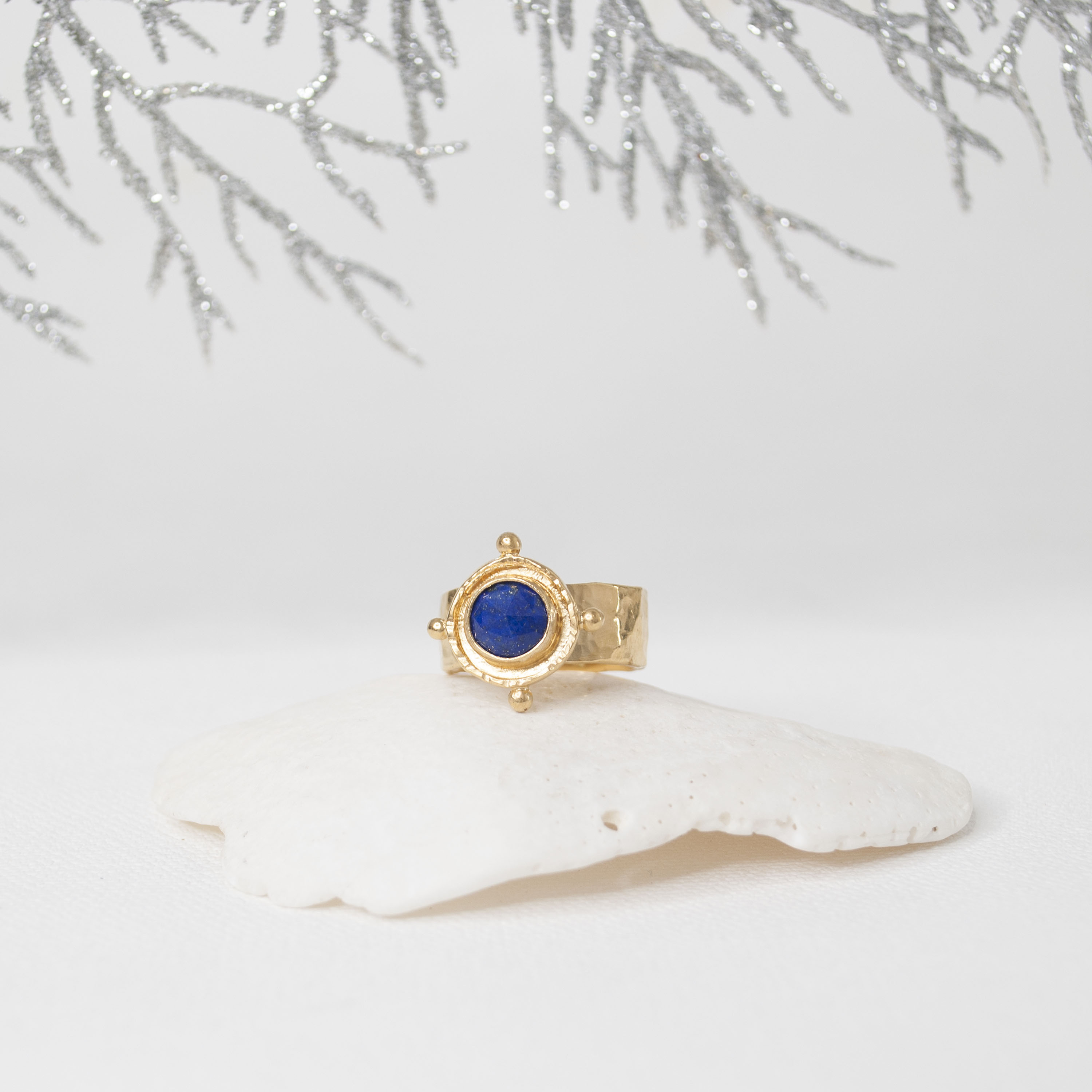 Strong ships aren't meant for safe harbours. Inspired by the helm of an old sea faring ship, this Gold Lapis Gem Medallion Ring is designed to accompany you as you navigate the joys of life.