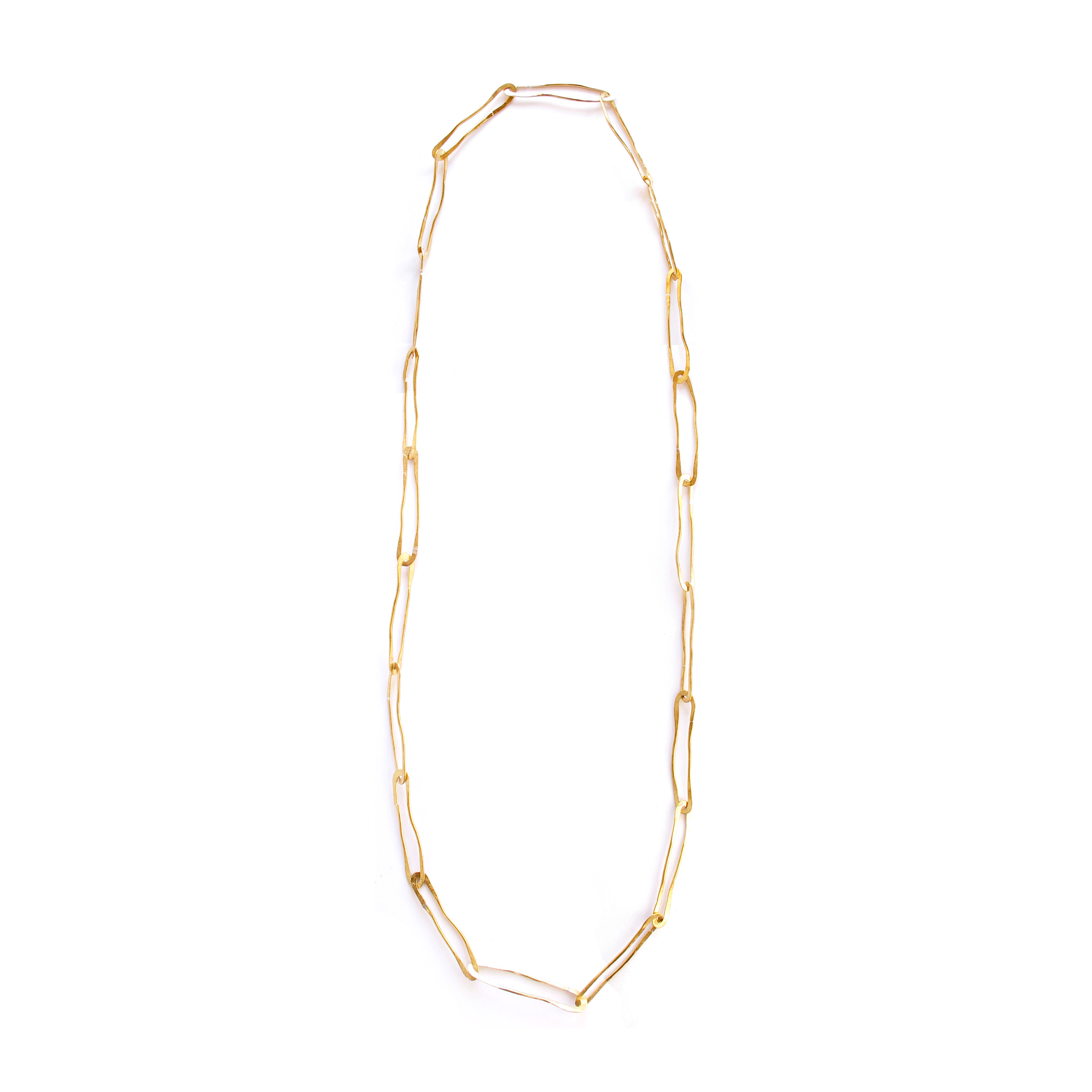 The gold long Elliptic chain necklace is Leander's artful take on the timeless paperclip style chain. This handmade chain necklace is an everyday classic that has been designed for those who like to wear pieces that carry a little piece of the artist's touch. Featuring perfectly forged, organically shaped links, this one of a kind hammered chain is delightfully comfortable and lightweight to wear.