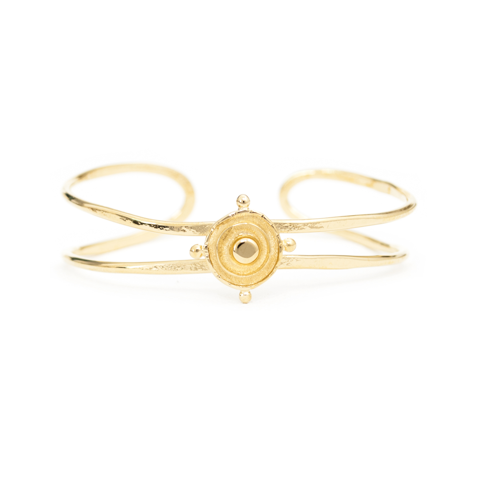 Strong ships aren't meant for safe harbours. Inspired by the helm of an old sea faring ship, this gold Nautical Medallion Cuff Bracelet is designed to accompany you as you navigate the joys of life. Perfect worn solo and also great for layering with other bracelets!