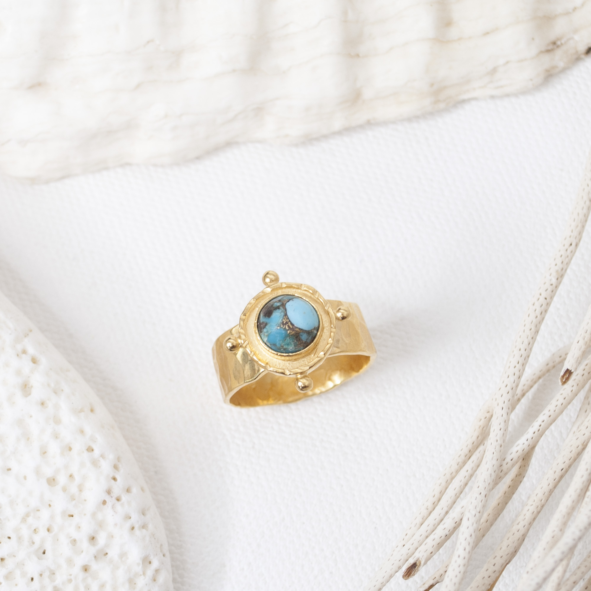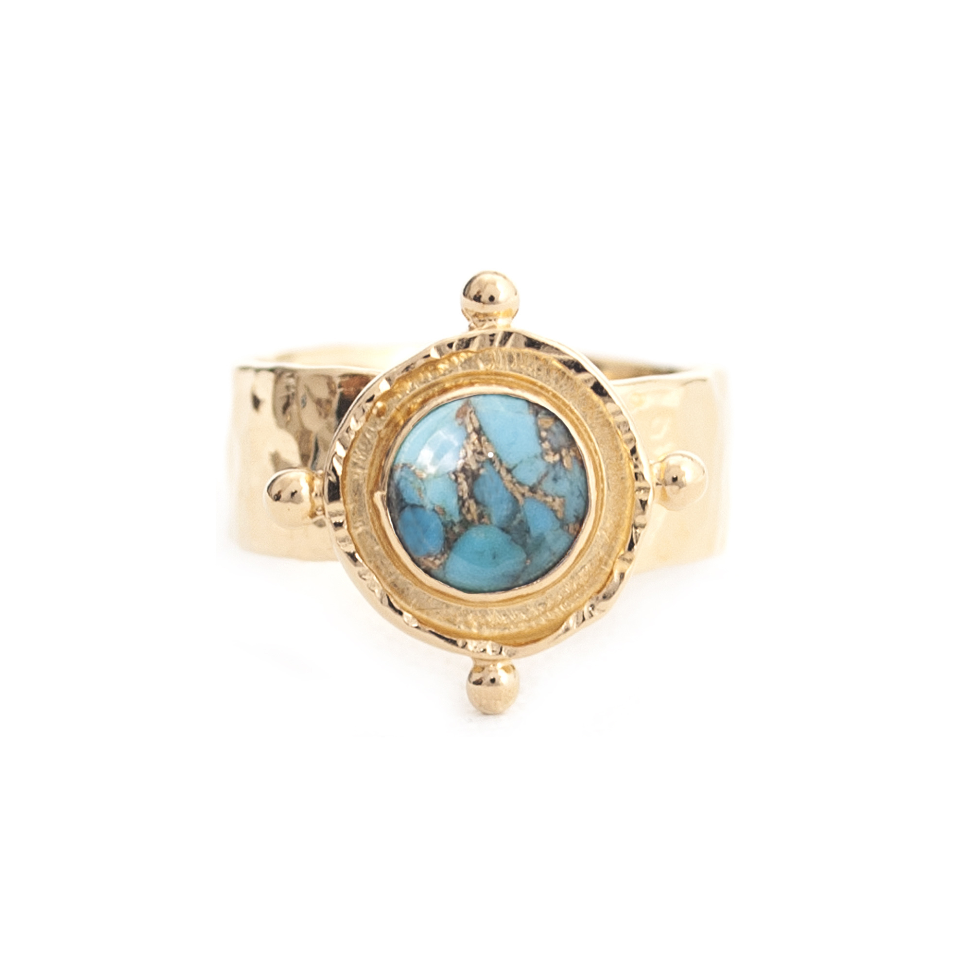 Strong ships aren't meant for safe harbours. Inspired by the helm of an old sea faring ship, this Gold Turquoise Gem Medallion Ring is designed to accompany you as you navigate the joys of life.