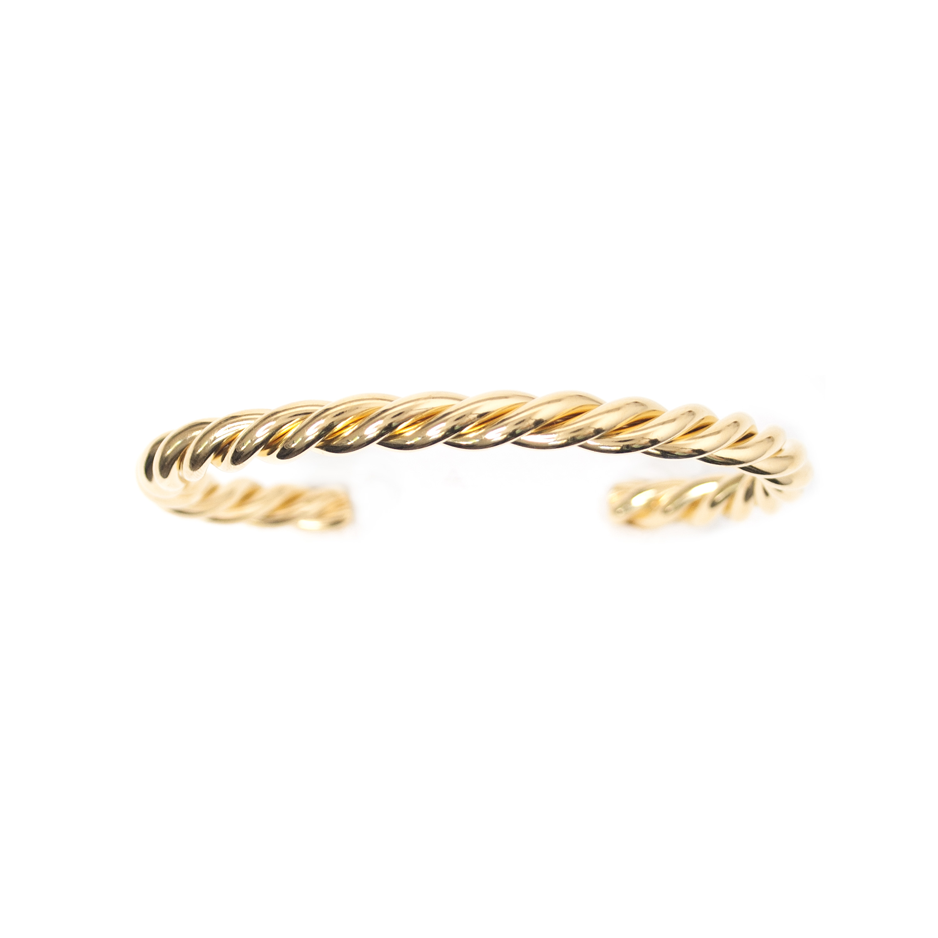 Entwined and bound together in unison, each strand of the gold twisted Rope Cuff bracelet is artfully braided together to create this classic twisted style bracelet. Designed to stand strong and be stunning when worn solo, while altogether perfect for layering with other bracelets too. This timeless bracelet will be a favourite to wear over and over again, night or day.