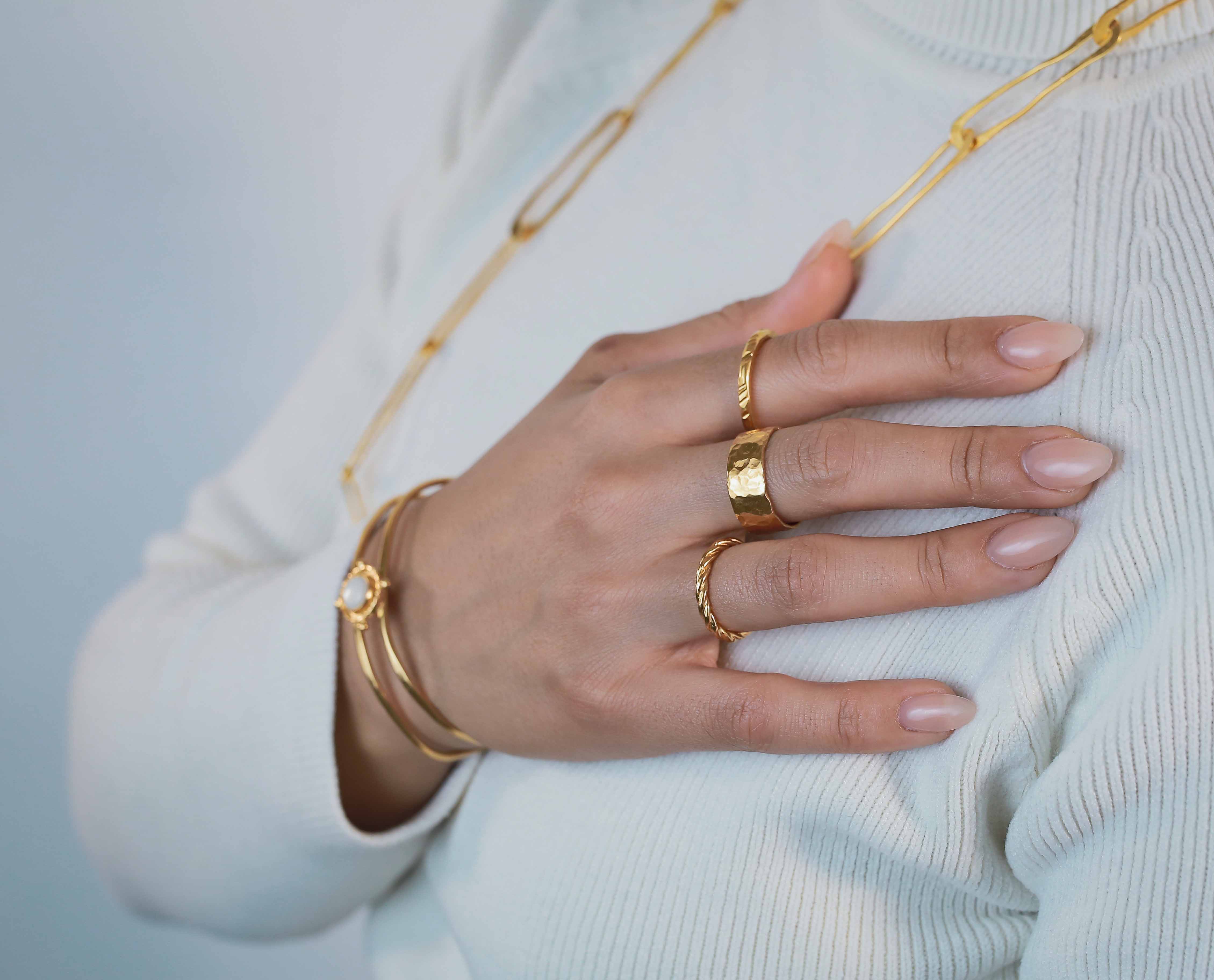 Style your ring stack with a twist with the gorgeous twisted gold Rope Ring. Featuring 3 strands of wire that have been seamlessly intertwined, this braided ring will quickly become a favourite. Perfect when worn solo and great for layering too!