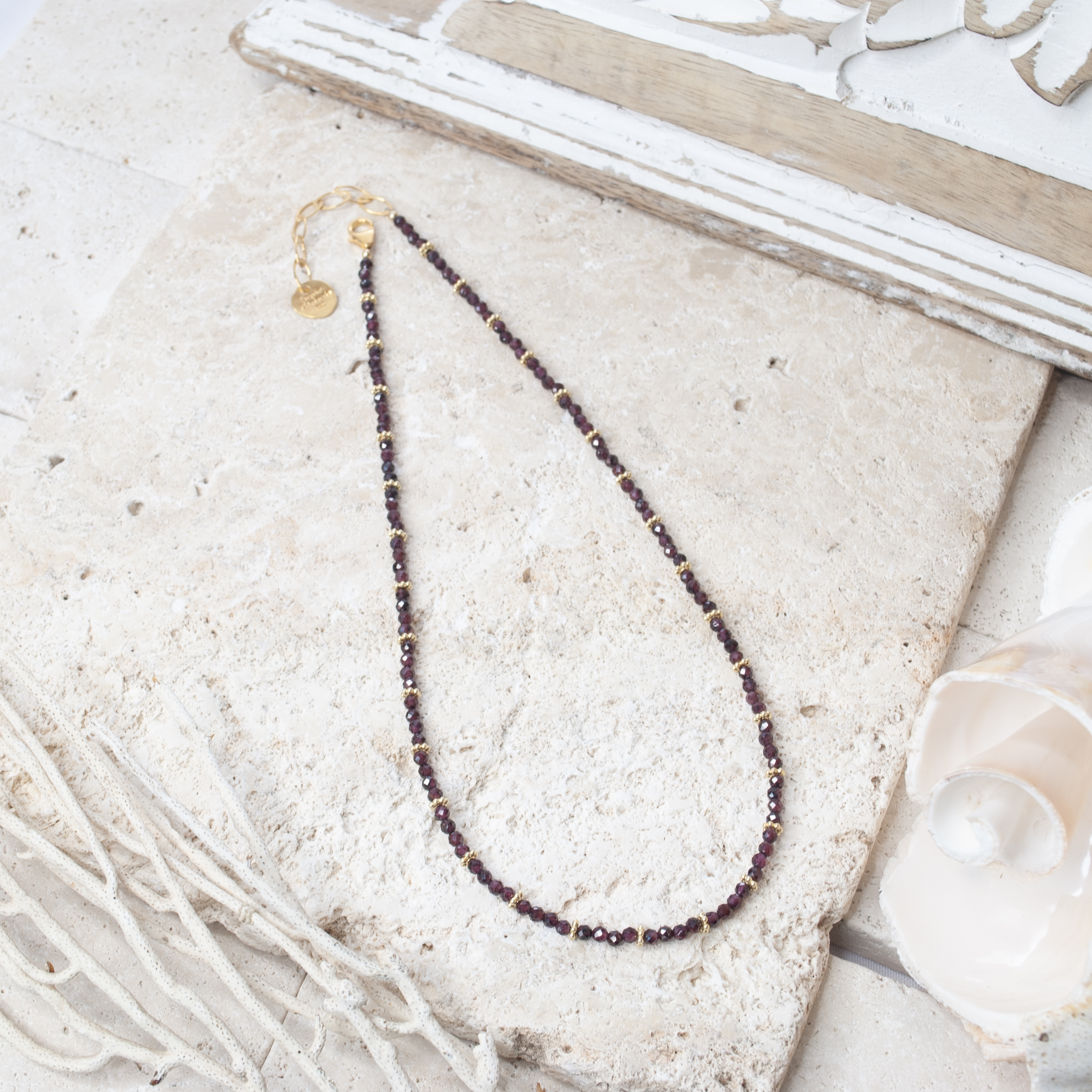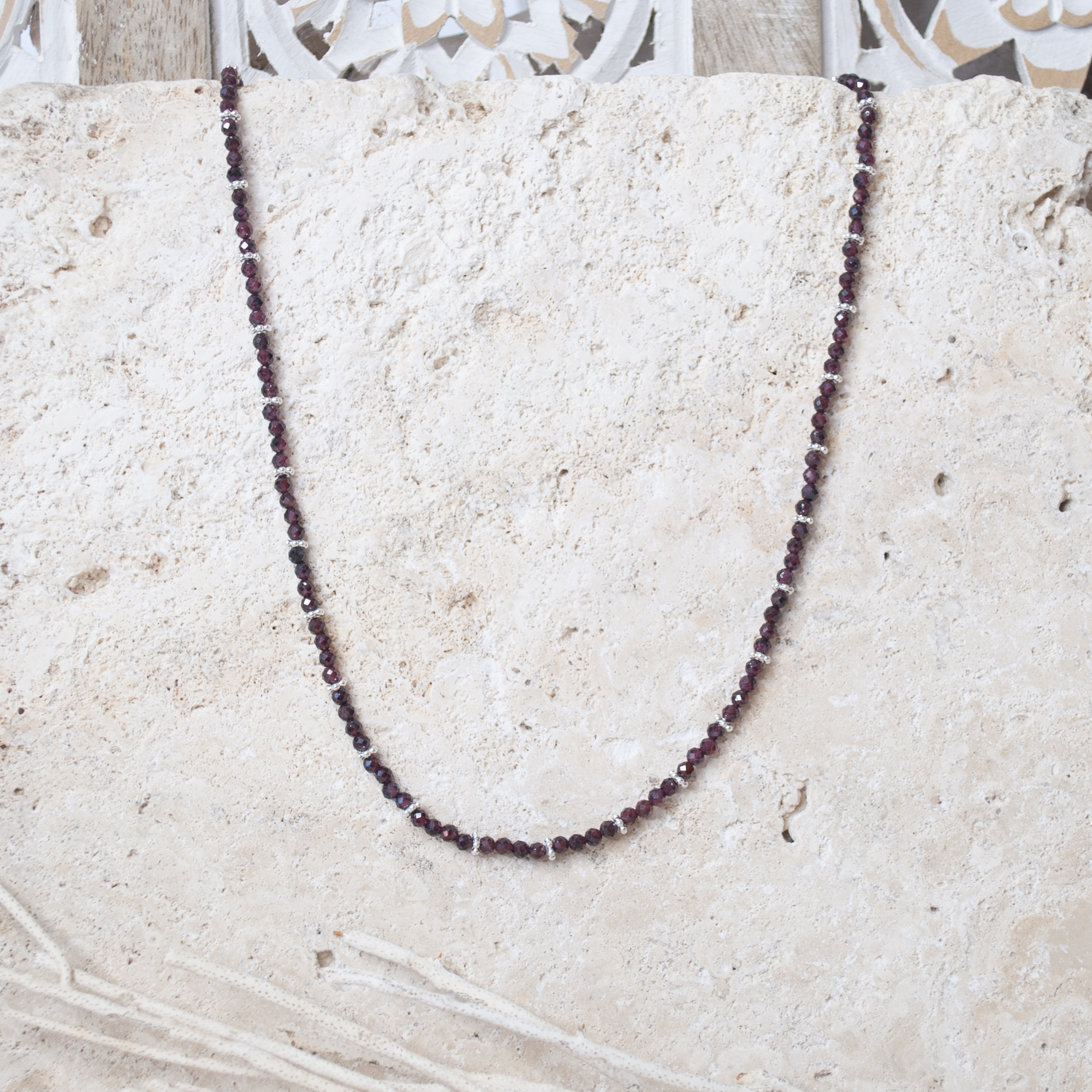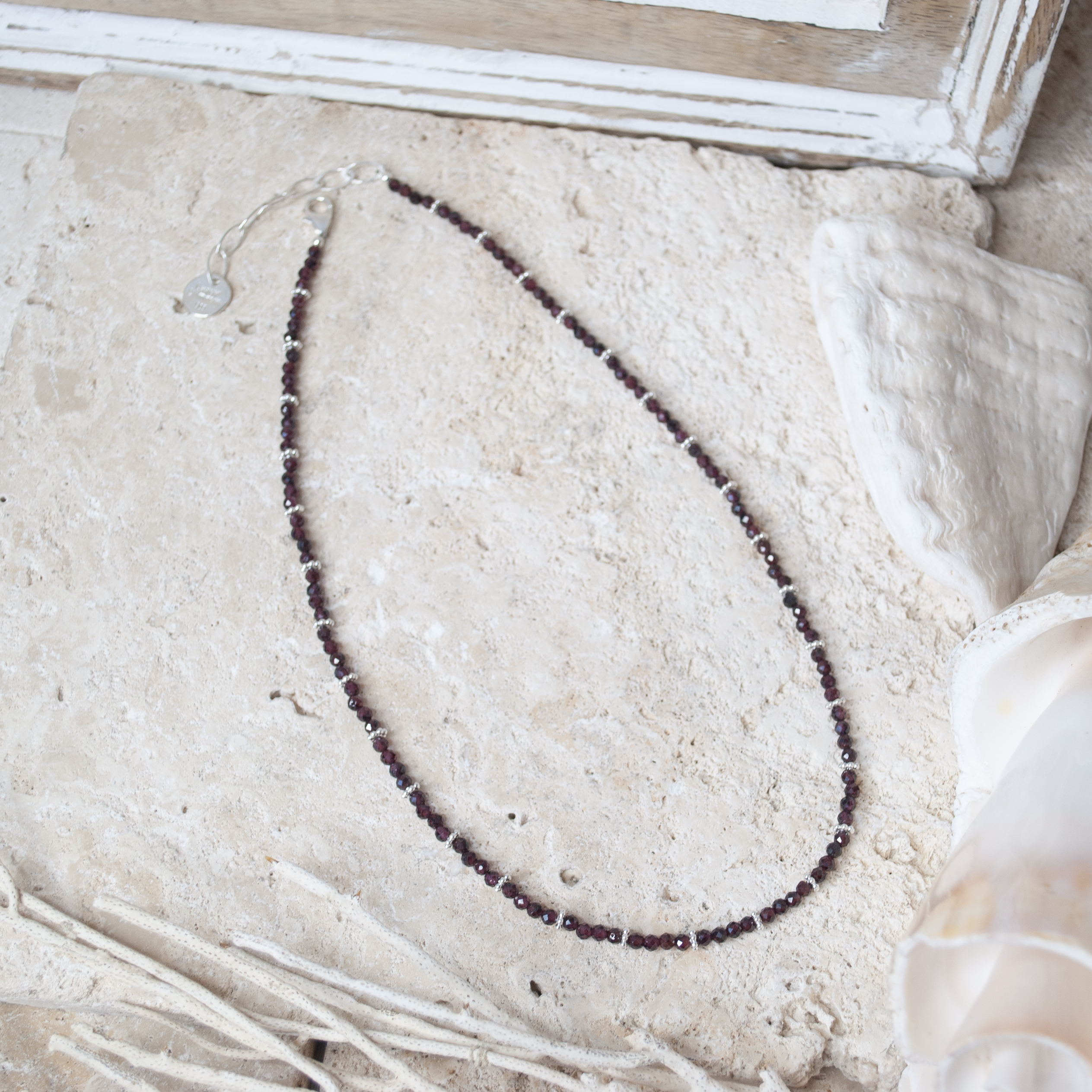 Add a striking string of colour to your necklace collection with this delicate silver garnet gemstone bead necklace. This short necklace was designed to look both fabulous worn solo, and dynamic when paired with other necklaces. Put together your new necklace stack and layer to your heart’s content!