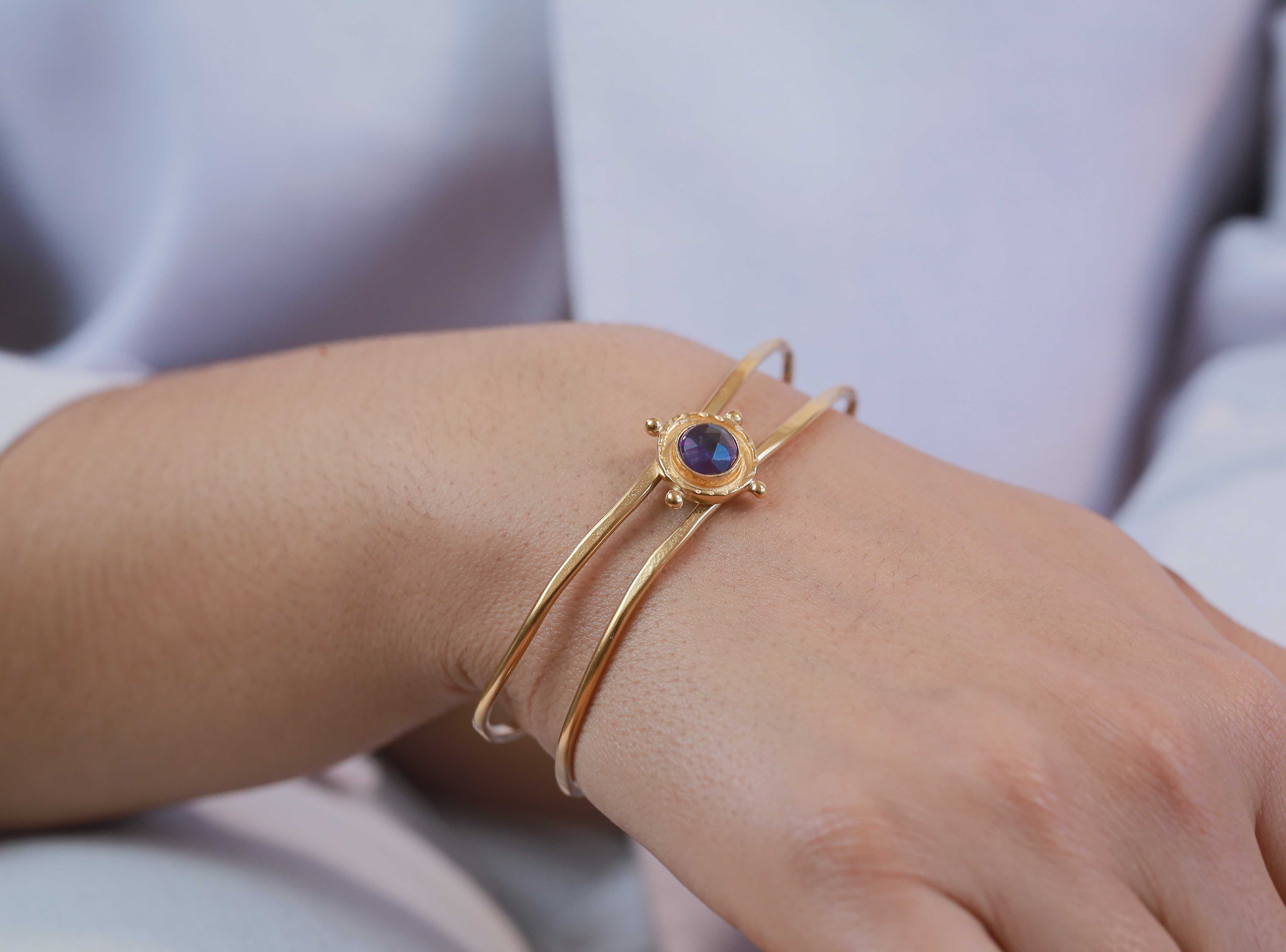 Strong ships aren't meant for safe harbours. Inspired by the helm of an old sea faring ship, this Silver Amethyst Gem Medallion Cuff Bracelet is designed to accompany you as you navigate the joys of life. Perfect solo and great when layered with other bracelets!