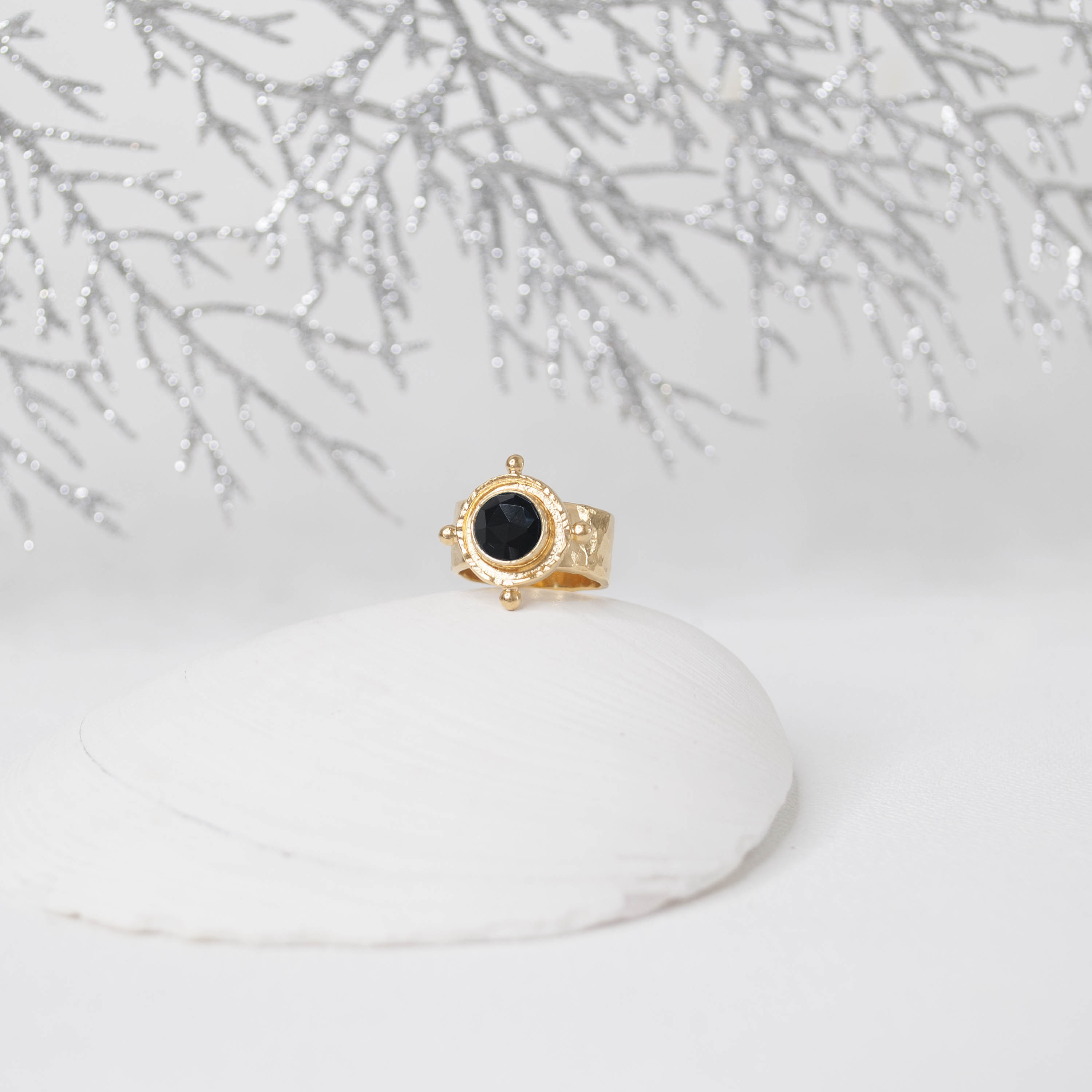 Strong ships aren't meant for safe harbours. Inspired by the helm of an old sea faring ship, this Silver Black Onyx Gem Medallion Ring is designed to accompany you as you navigate the joys of life.