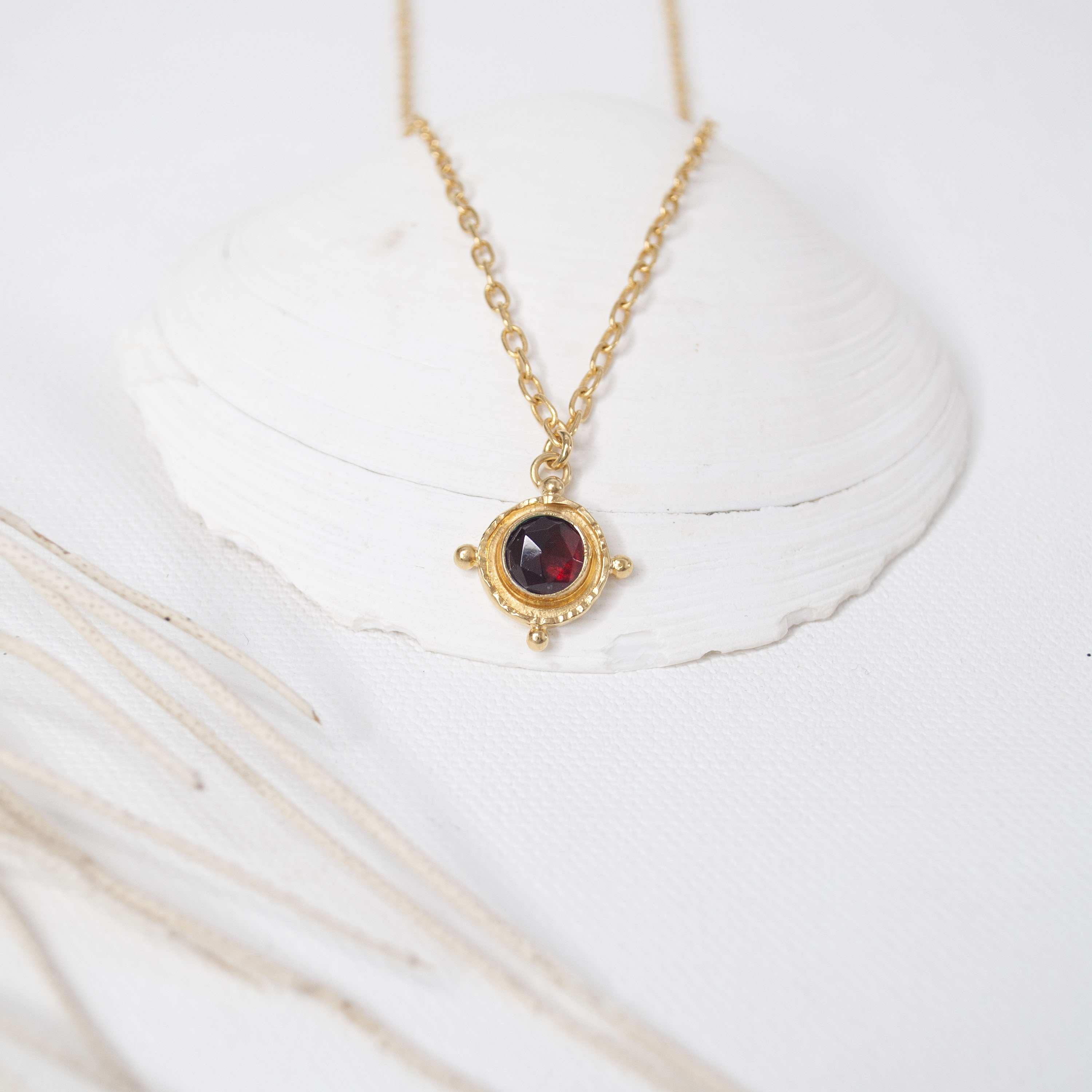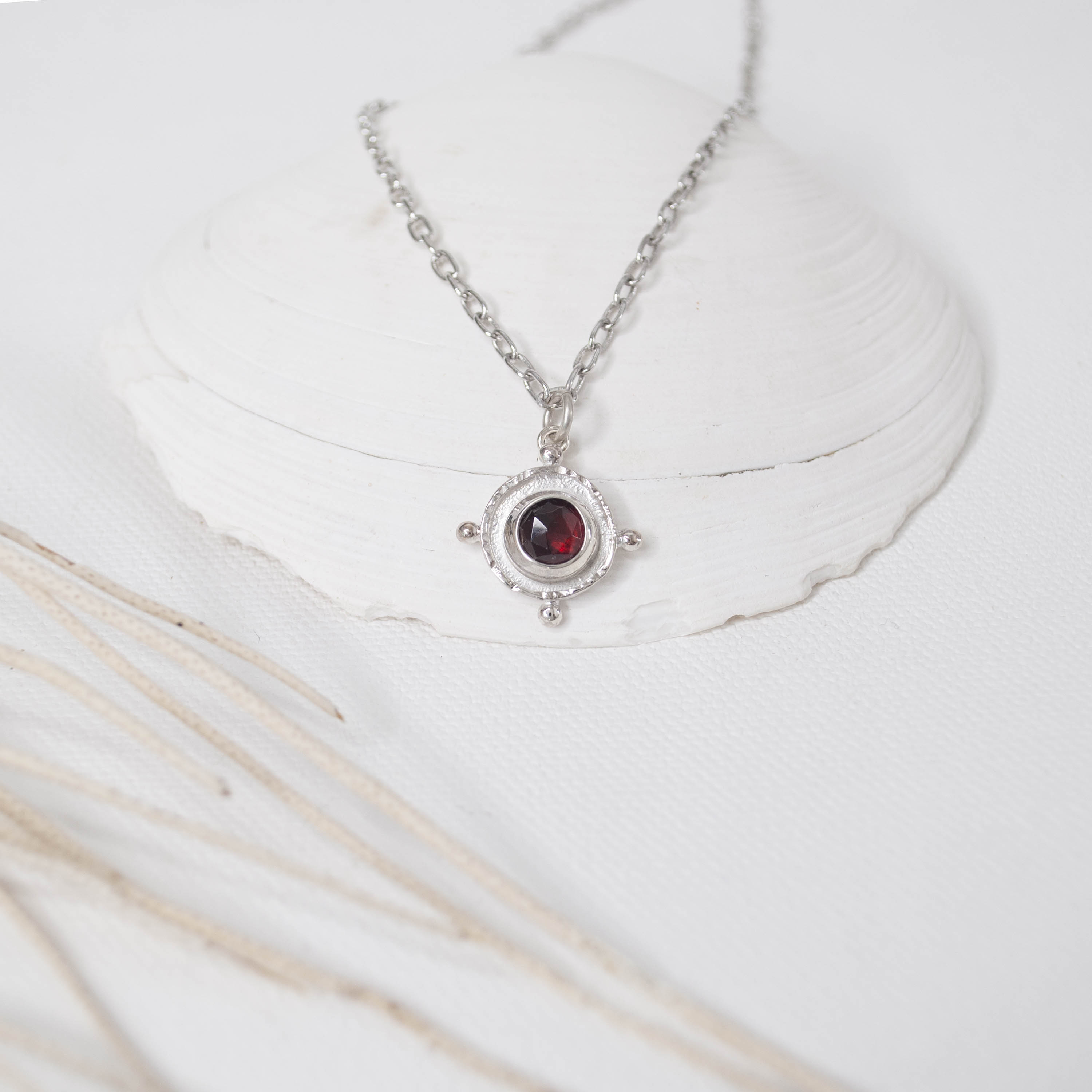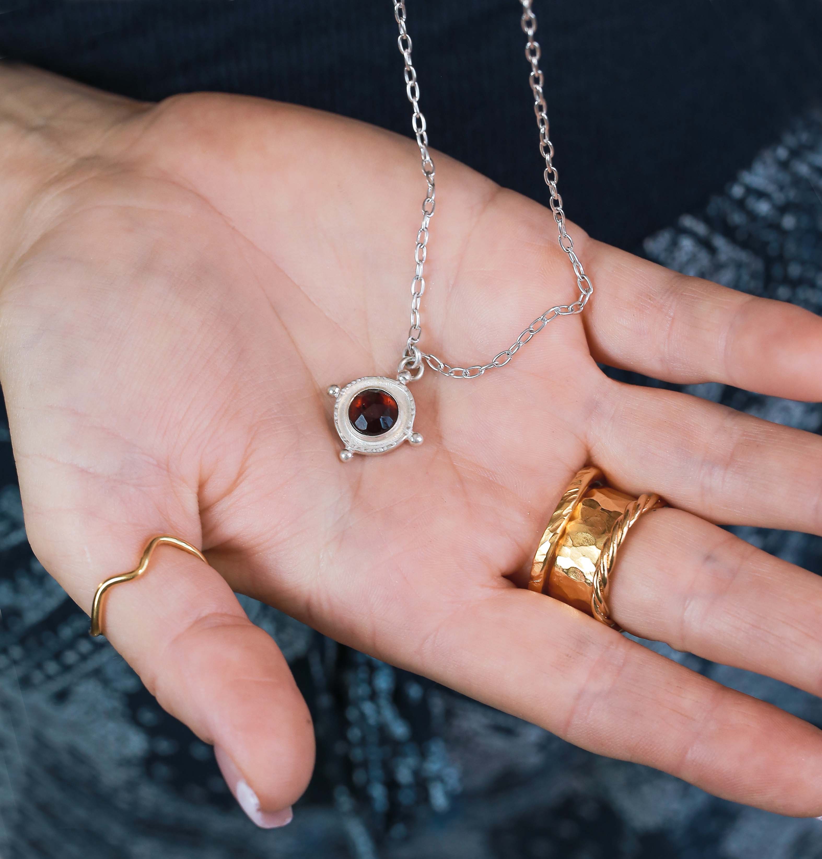 Strong ships aren't meant for safe harbours. Inspired by the helm of an old sea faring ship and antique nautical motifs, this Silver Garnet Gem Medallion Necklace is designed to accompany you as you navigate the journey of life. This necklace is perfect solo and also great when layered with other necklaces!