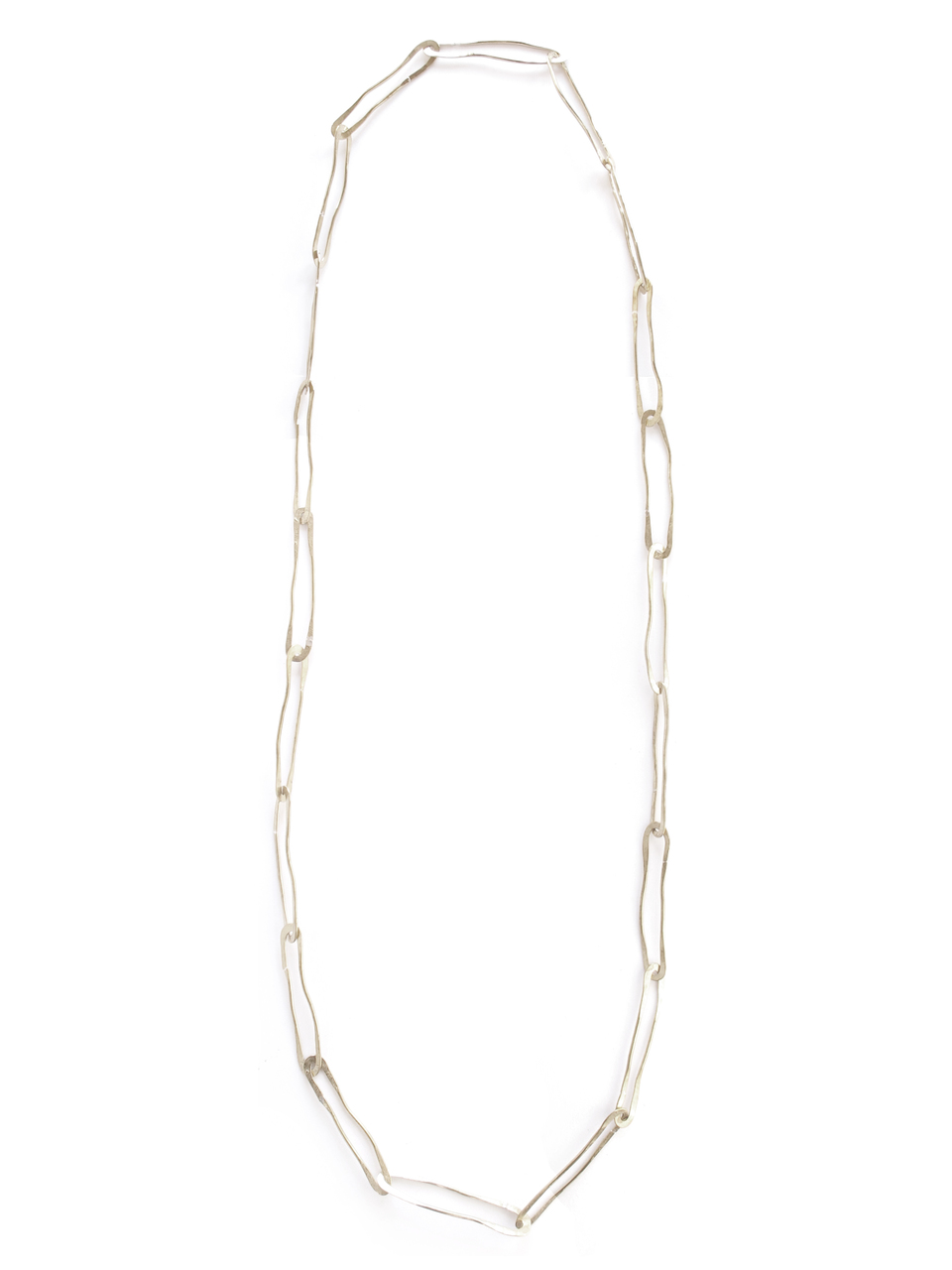 The silver long Elliptic chain necklace is Leander's artful take on the timeless paperclip style chain. This handmade chain necklace is an everyday classic that has been designed for those who like to wear pieces that carry a little piece of the artist's touch. Featuring perfectly forged, organically shaped links, this one of a kind hammered chain is delightfully comfortable and lightweight to wear.