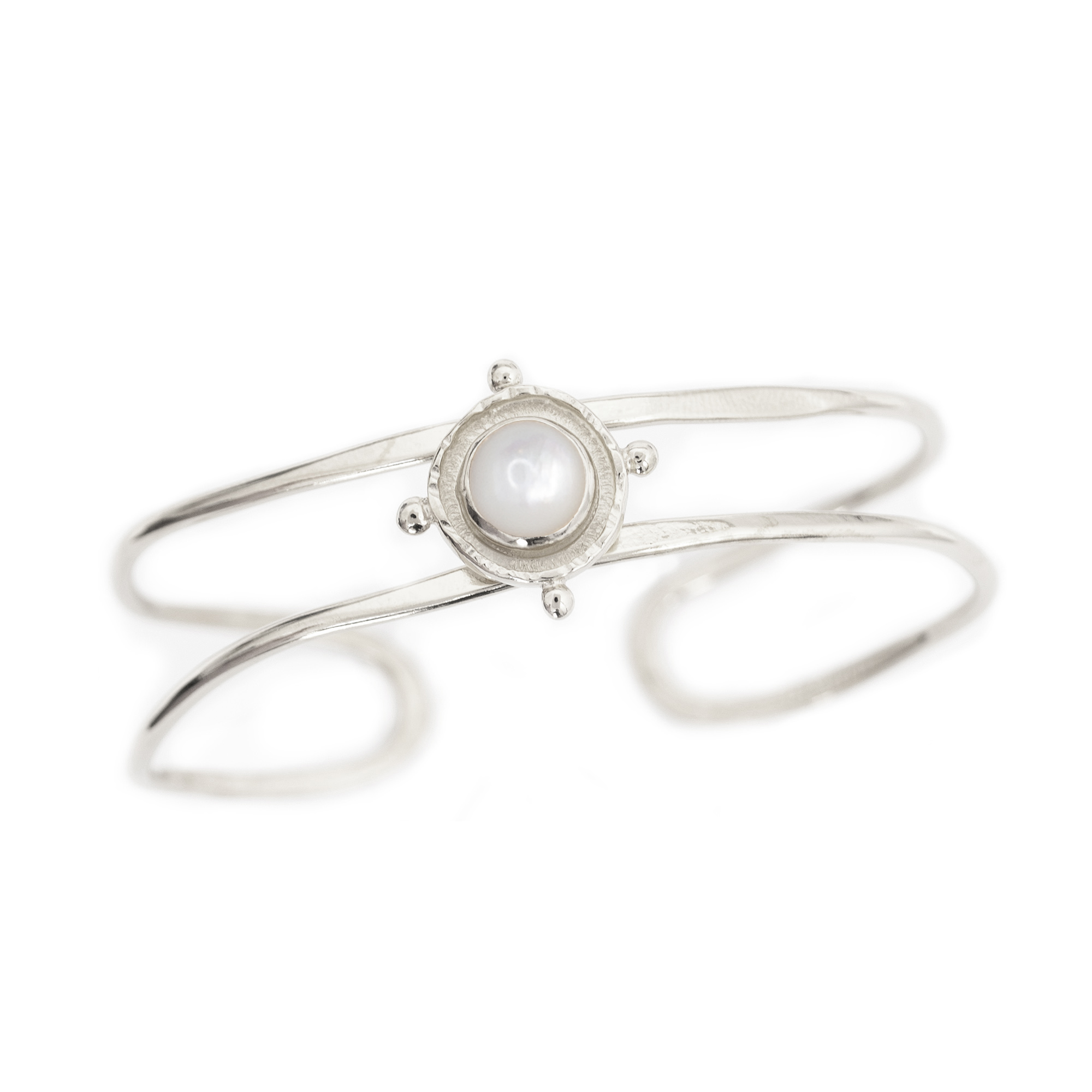 Strong ships aren't meant for safe harbours. Inspired by the helm of an old sea faring ship, this Silver Pearl Gem Medallion Cuff Bracelet is designed to accompany you as you navigate the joys of life. Perfect solo and great when layered with other bracelets!
